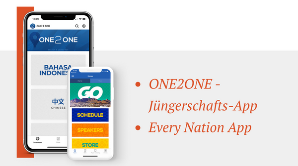 One2One ist ein einfacher Jüngerschaftsleitfaden in Form einer Sieben-Lektionen-Reihe zur persönlichen Nachbetreuung. Der Leitfaden ist als App in 20 Sprachen verfügbar und wird durch internationale Übersetzungsteams laufend erweitert. Die Every Nation App ist die Anlaufstelle für globalen Every Nation Podcasts, Veranstaltungsinformationen und Berichte darüber, was Gott weltweit durch unsere Gemeinden und Dienste bewirkt.